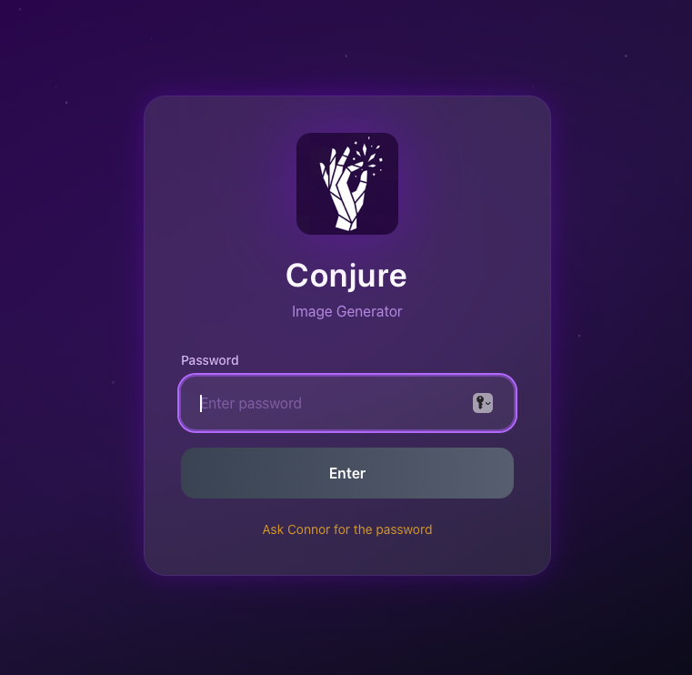 The first version was minimal: a password gate and a simple prompt input. Image generation worked, but the UX was buggy and refreshing the page meant you lost your image.