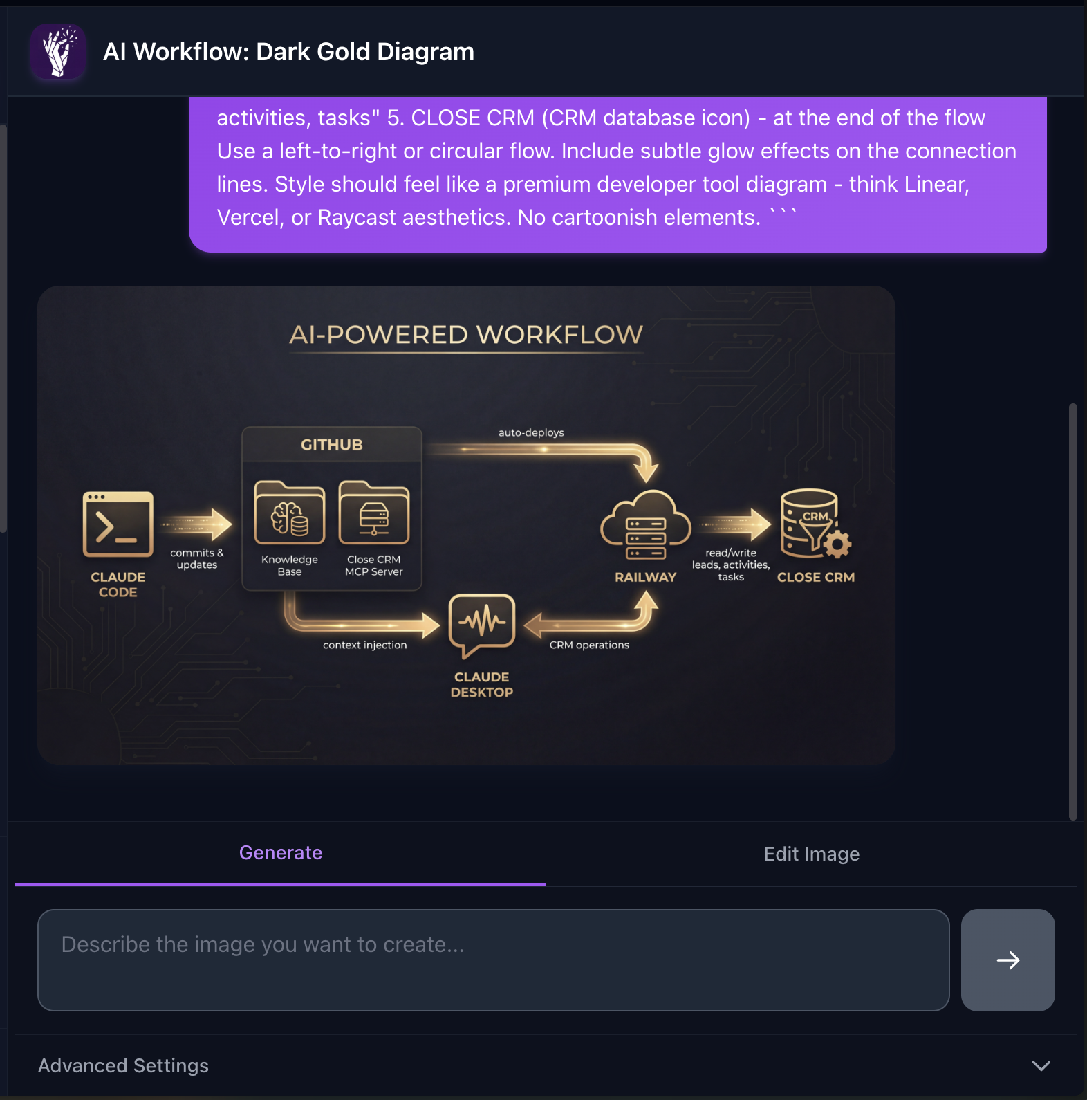 I actually used Conjure itself to create the workflow diagram for another project on this site. Here's a screenshot of that generation – a tool building assets for its own portfolio page.